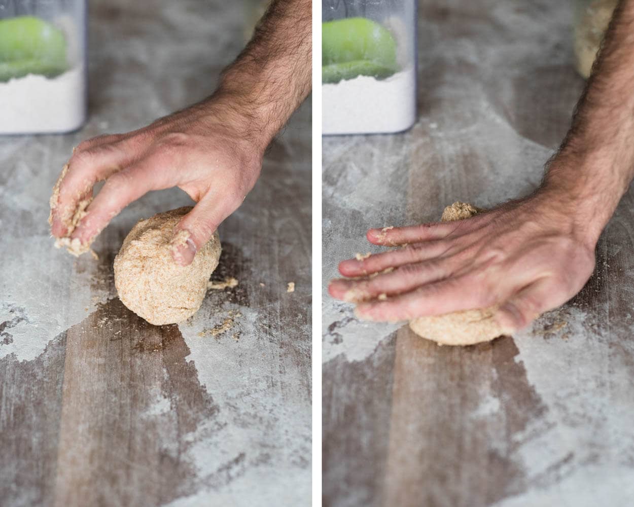 Fill a small bowl with water and place it next to your work surface. Scrape the dough onto a clean work surface and divide it into two equal pieces. With one wet hand and a bench knife in the other, preshape the pieces of dough into loose rounds.