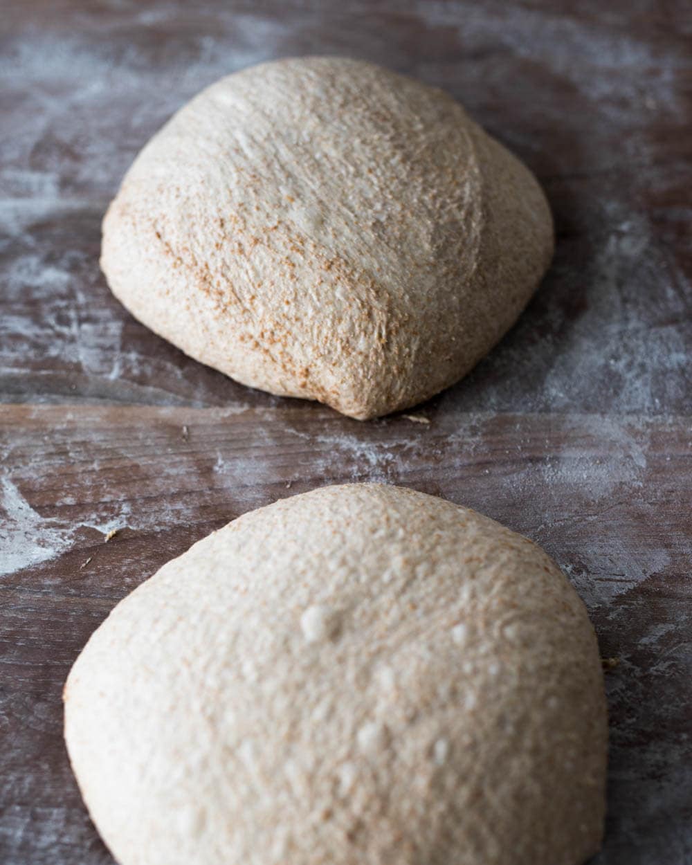 Due to the nature of whole wheat flour and the high level of nutrients available for your starter or levain, dough fermentation will be vigorous. Keep an eye on your dough during bulk fermentation, especially if it’s warm in your kitchen, and divide the dough when it looks ready (more on this later).