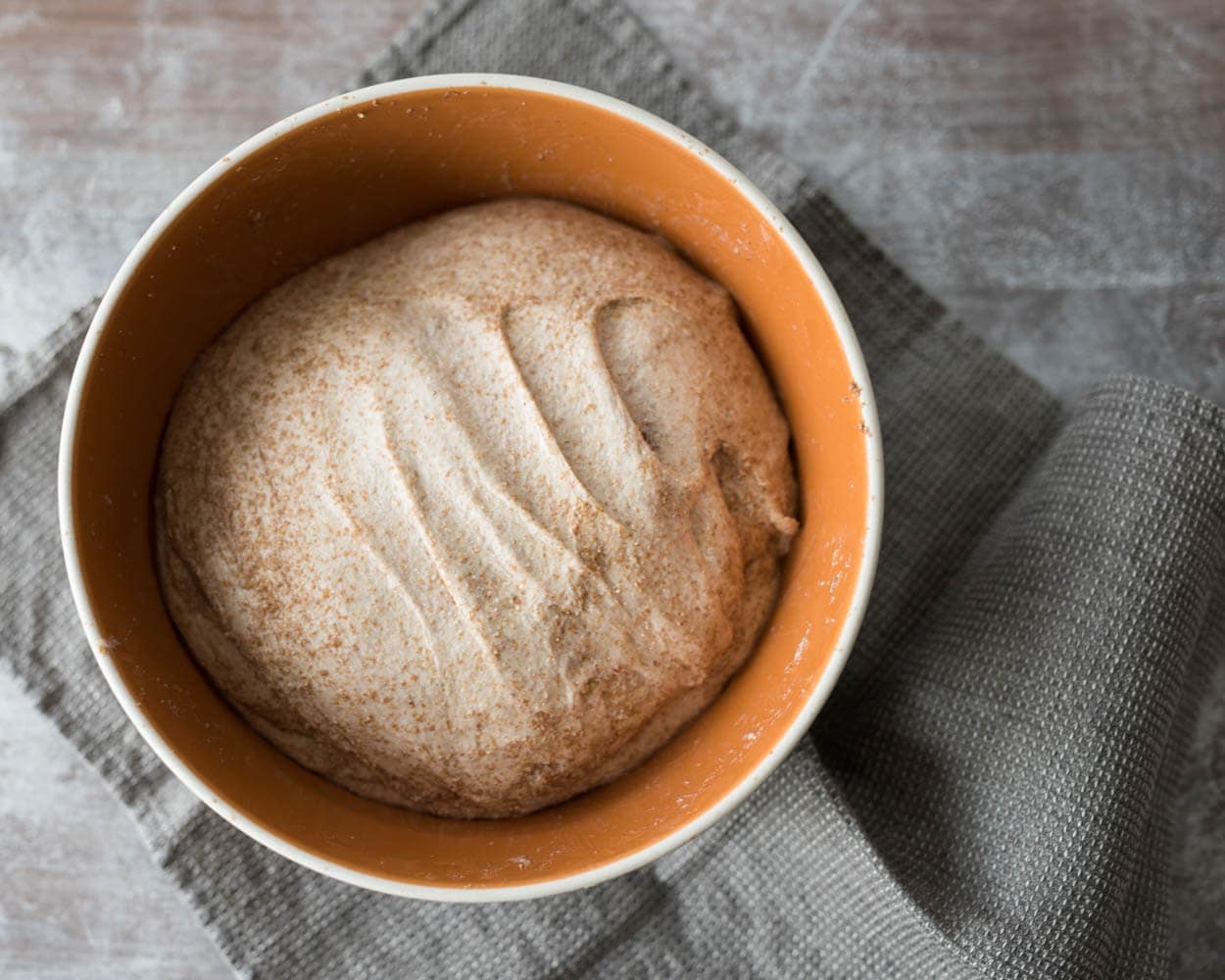 After 3 hours, the dough should be risen and puffy in the bulk fermentation container. Because of the high percentage of freshly milled flour and whole grains, the dough may not rise as high as a recipe with more white flour. It will be ready to divide when the top of the dough is smooth, bubbly, and the edge where the dough meets the container is slightly domed downward.