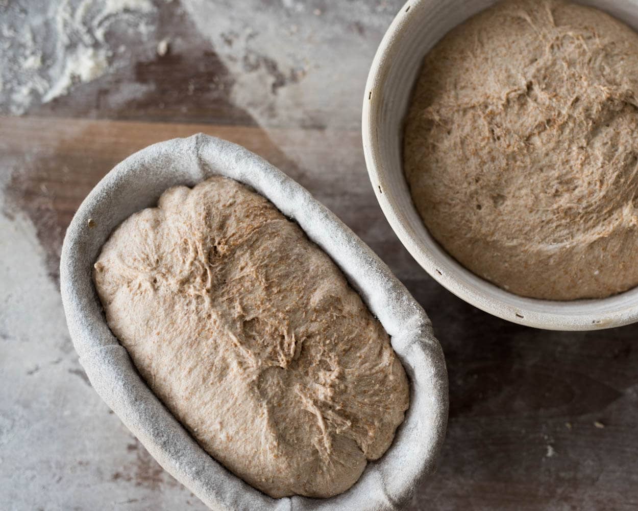 Gently transfer the dough to an 11-inch long proofing basket, seam-side up. Repeat with the remaining round.