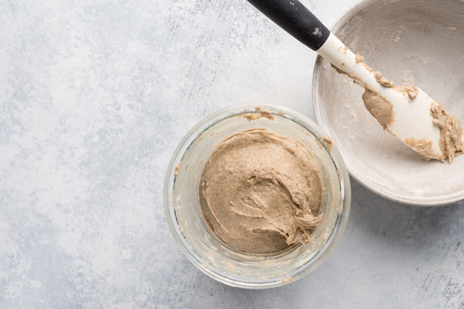 - Place a clean jar on your scale and scoop in some portion (outlined below) from the jar you just stirred down