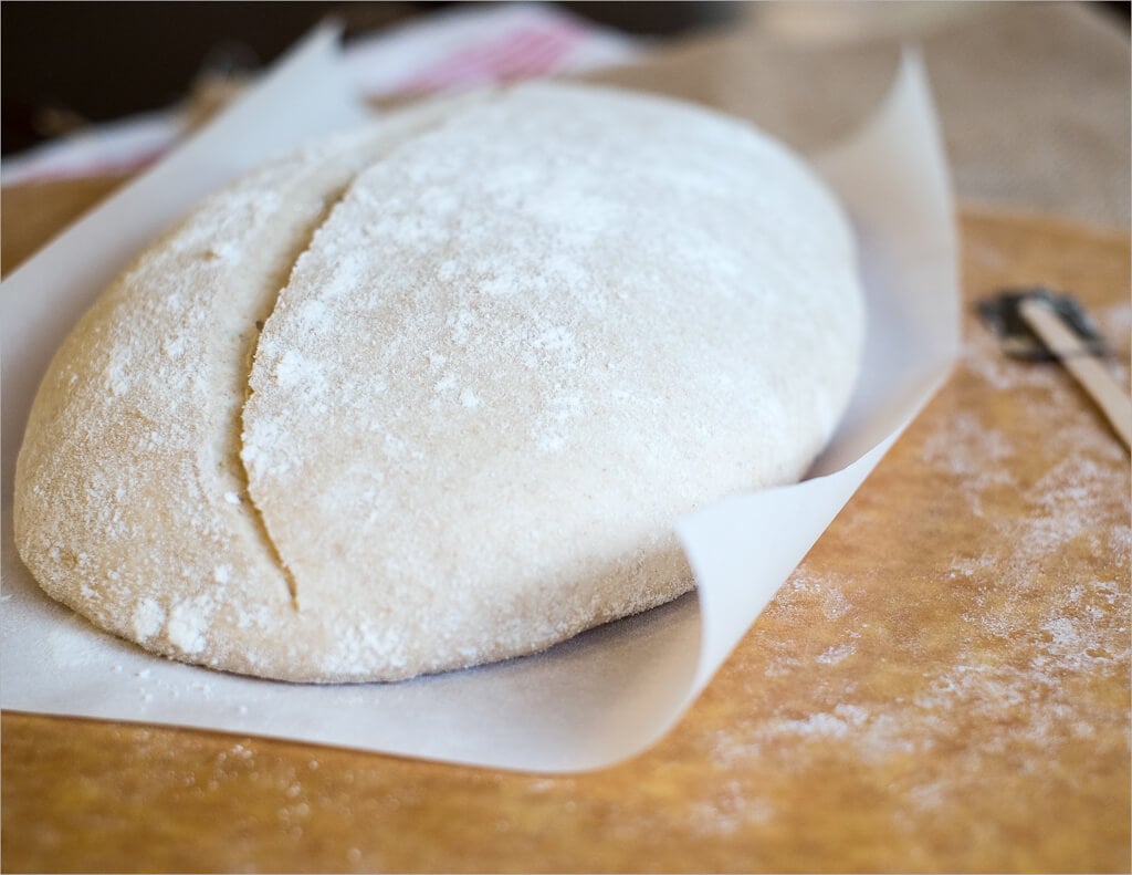 The resting dough should have spread out some on the counter. Flour the top of one of the boules and flip it over with your lightly floured hand and dough knife. Take the part of the dough that’s closest to you and fold it up and over in half. Take the part that’s to the right, stretch it out as far as it will stretch, and fold it up and to the left. Repeat with the left side and the side of the dough farthest from you. Then take the edge that’s closest to you, pull it up and over again towards the back. When doing this last move you will lift the entire dough up and over until the seam side is now down on your work surface.