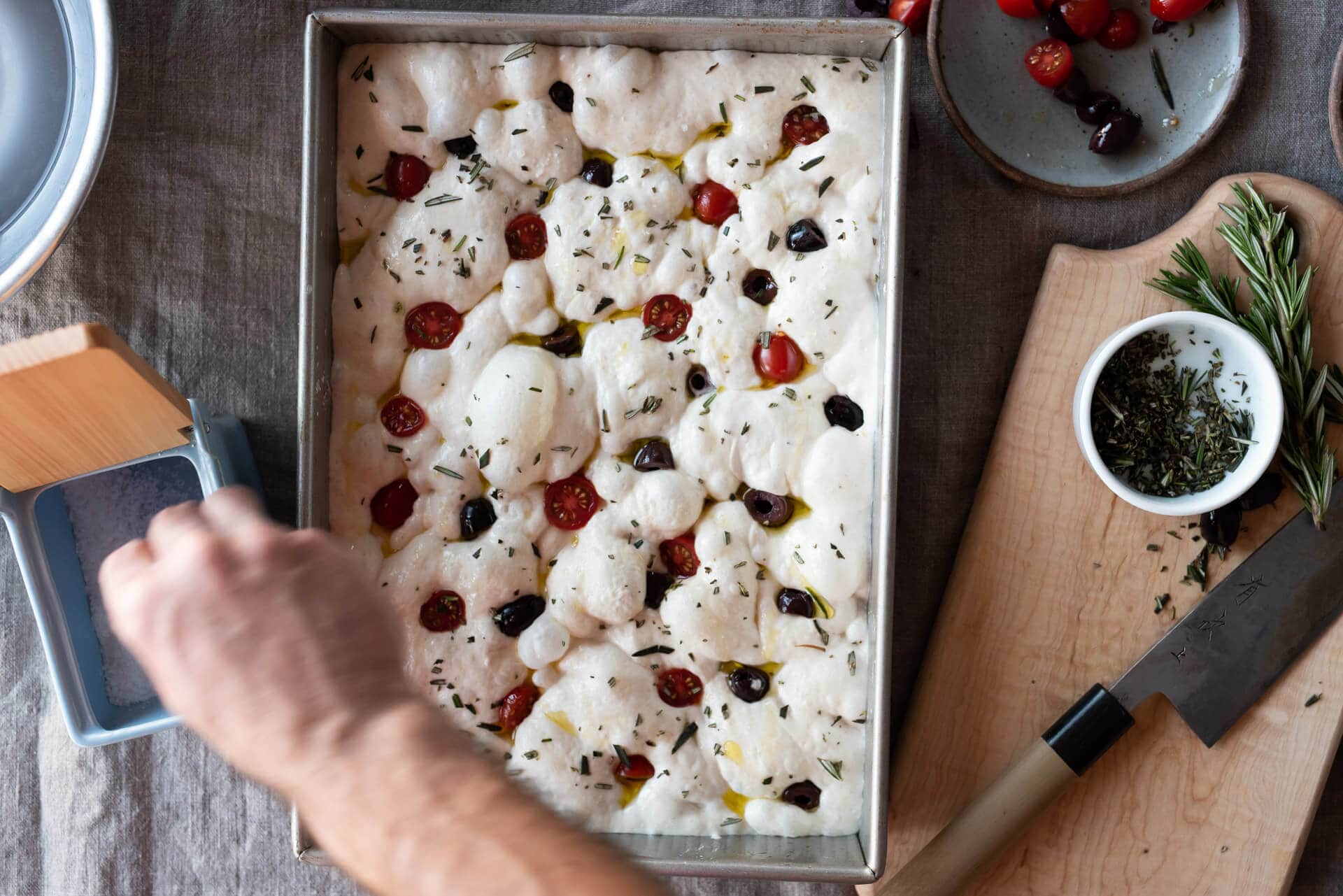 First, dimple the unadorned dough with wet fingers. Make sure the dimples are evenly spaced and go all the way down to the bottom of the pan. Then, drizzle on 1-2 tablespoons of your extra virgin olive oil and sprinkle with herbs and coarse sea salt. If using other toppings, add them now as well—I like to press them into the dough gently.