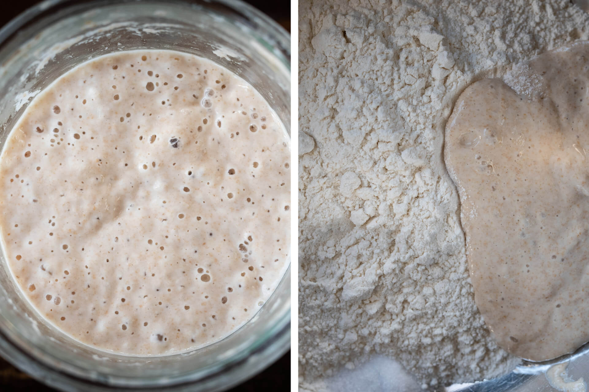 As you can see below on the left, the dough is still very wet and chunky immediately after mixing. However, it’s not falling apart or soupy. Please resist the temptation to add more flour at this point. As you can see below in the image at the right, by the middle of bulk fermentation, it’ll strengthen after several sets of stretch and folds (see my guide on how to stretch and fold sourdough for more information).