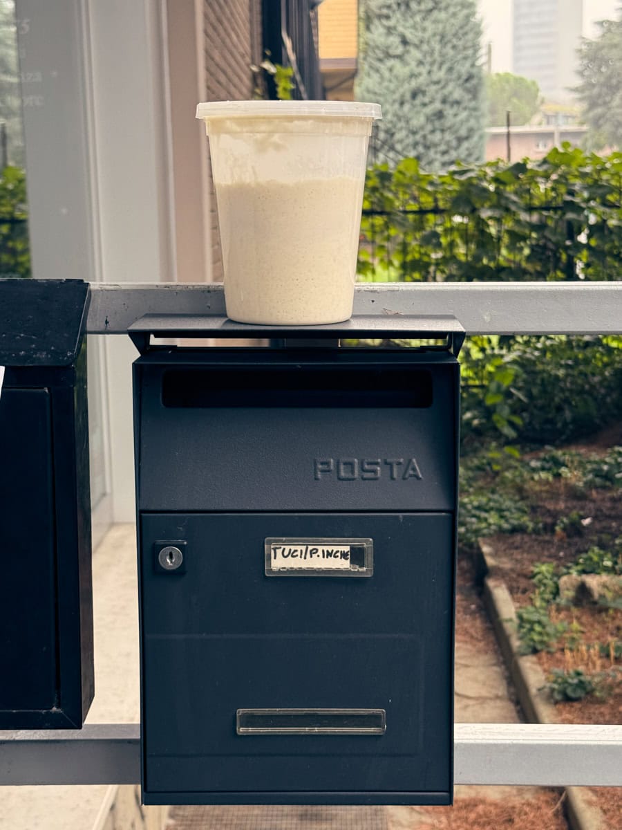 When I landed in Bologna, my first stop was at Carrefour to pick up a bag of flour, then I headed to my hotel, where I fed my starter equal parts flour, starter, and warm water for a fast 3-hour ripening time. This helped to get it ramped up before another feeding at night, and then it was ready to use by the next morning.