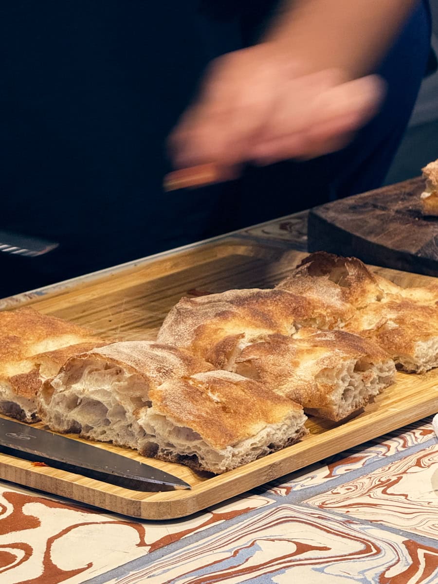 In the evening before dinner, around 6:45 p.m., surrounded by my fellow bread-heads, I had more or less (probably more) six pieces of ethereal focaccia, a flaky croissant bun topped with bresaola, copious chunks of creamy cheese, and a glass of mineral-forward white wine.