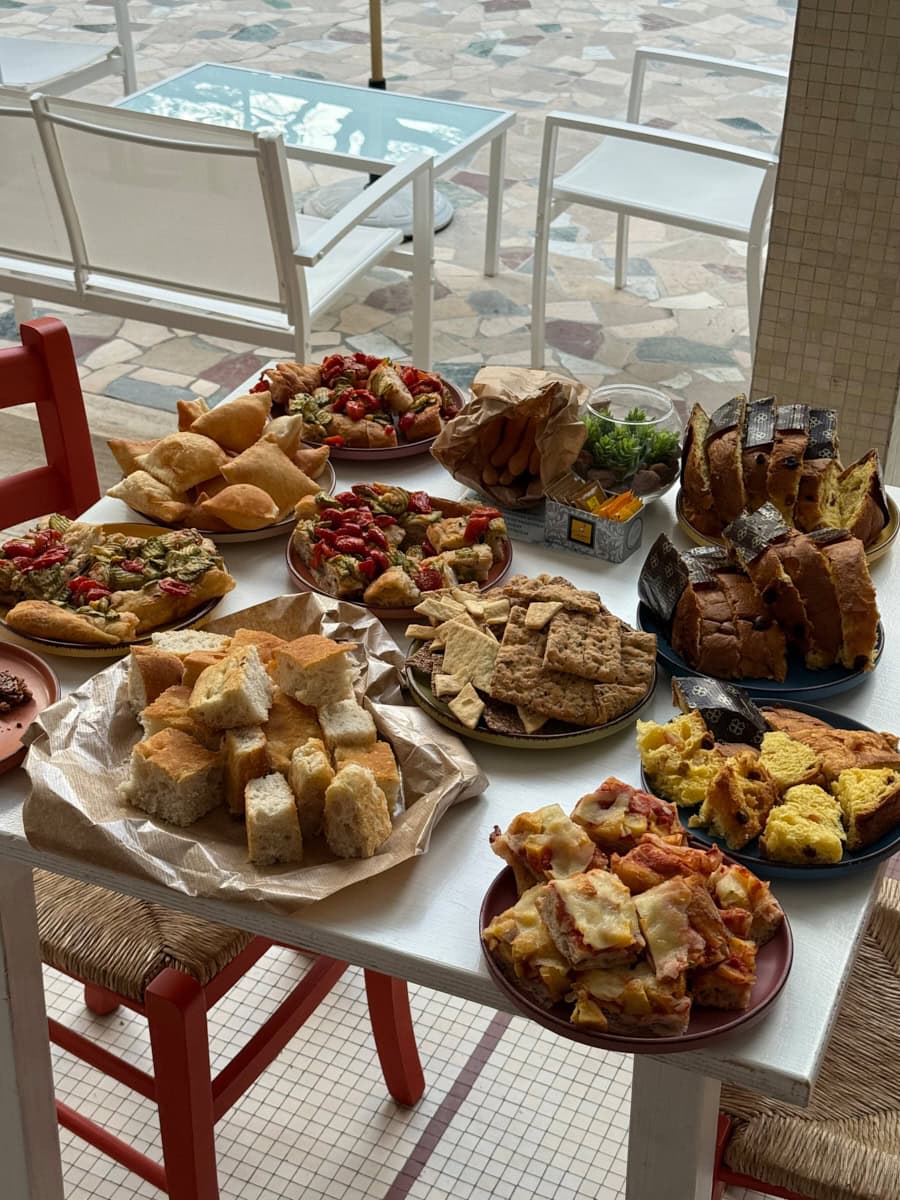 That evening, Matt, Angela, and I gathered a spread of bakery goodies (see below) and brought along a panettone from our visit to Olivieri to share with the guests. We set up an impromptu aperitivo at the hotel, sipping spritz after spritz and nibbling salty focaccia and pizza while a DJ spun music for the aforementioned dancing locals nearby.