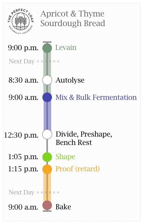 This apricot and thyme sourdough bread takes two days to make (not including the levain). The cold overnight proof gives the dough ample time to ferment, thus increasing the final fermentation flavors and making for a more manageable dough to score before baking.