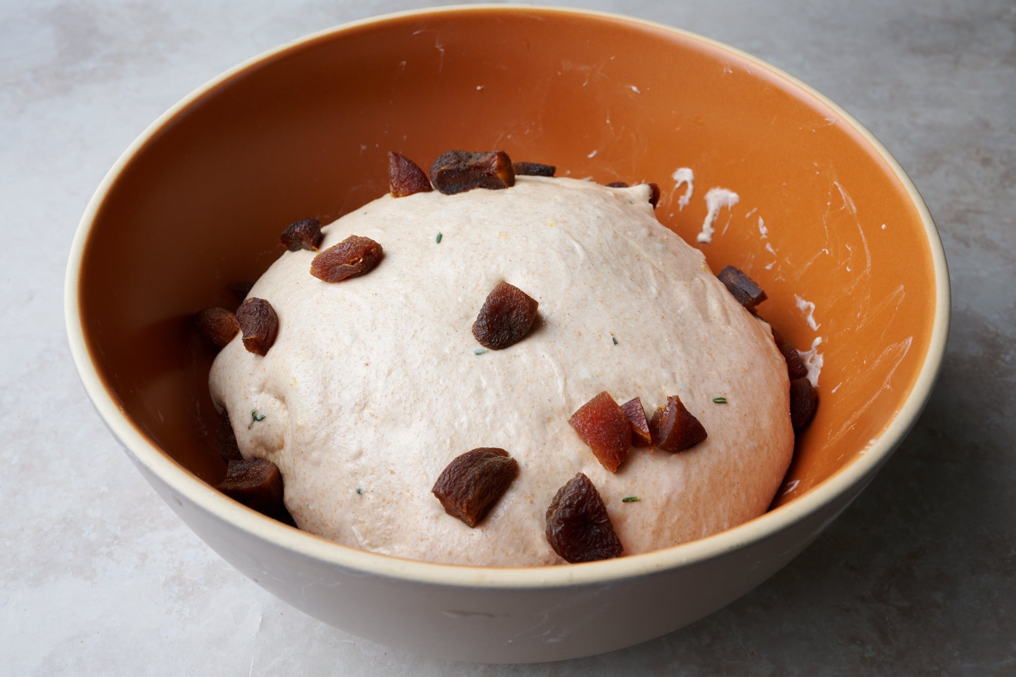 This dough requires 2 sets of stretches and folds during bulk fermentation. After the first 30 minutes, spread about one-quarter of the chopped apricots over the top of the dough. Wet your hands, grab the side of the dough farthest from you, and stretch it up and over to the other side. Next, spread on another one-quarter of the inclusions. Rotate the bowl 180-degrees and perform another stretch and fold. Next, spread on another one-quarter of the inclusions, rotate the bowl 90-degrees, and do another stretch and fold. Finally, spread on the last of the inclusions, turn the bowl 180-degrees, and do one last stretch and fold. The dough should be neatly folded up in the bowl.