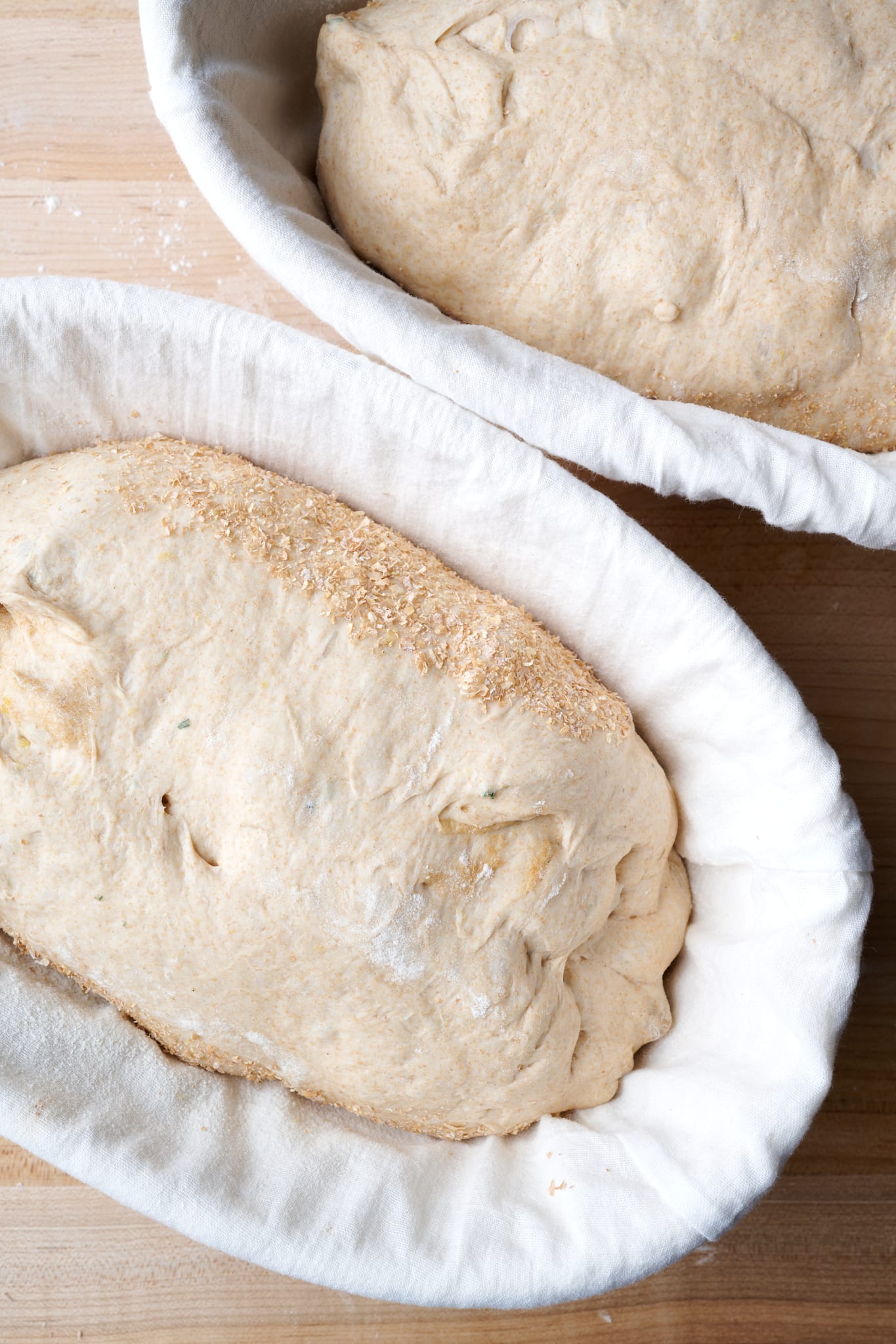 Line two proofing baskets with clean kitchen towels. Dust lightly and evenly with white flour.