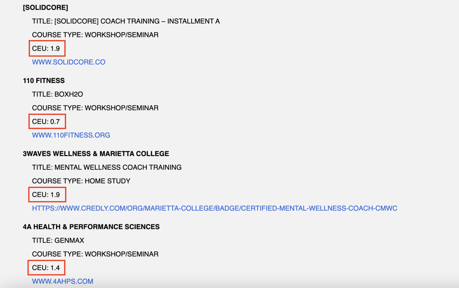 For example, NASM has a list of continuing education courses, which you can see here. They also have a list of approved third-party courses, shown here.