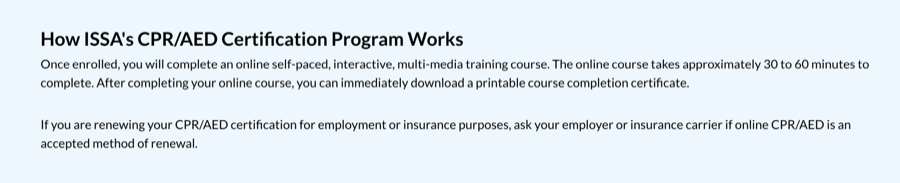 Then, we have a CPR/AED certification, which requires you to complete a course in several hours and pass an exam. It costs up to $60 and lasts for two years.