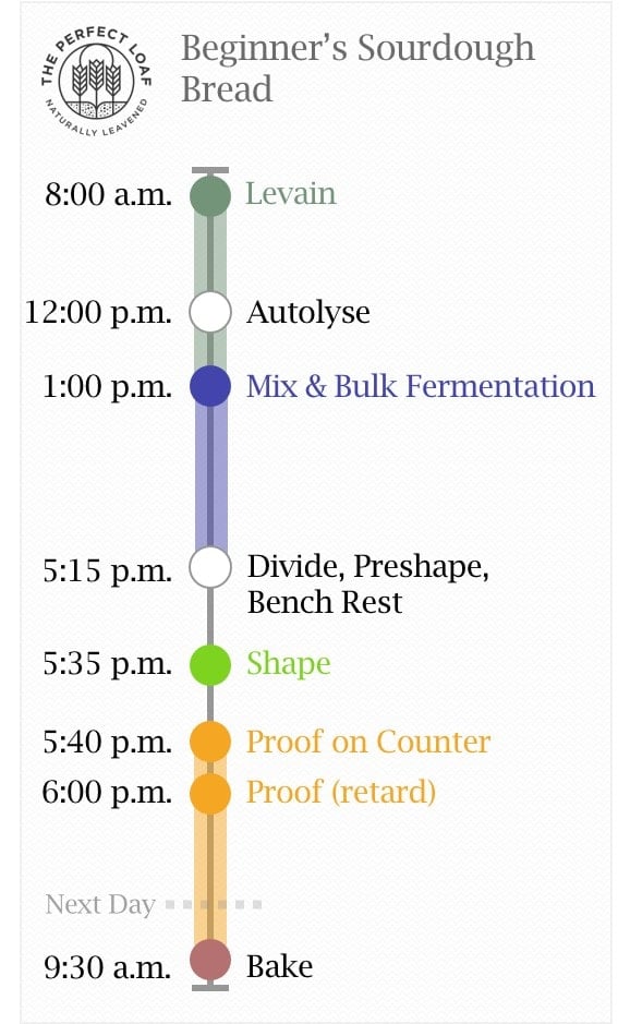 While the recipe calls for 16 hours of total proof time, you could extend this time and bake the loaves in the morning, afternoon, or even the evening on day two. Leave the proofing dough in the fridge until ready to bake.