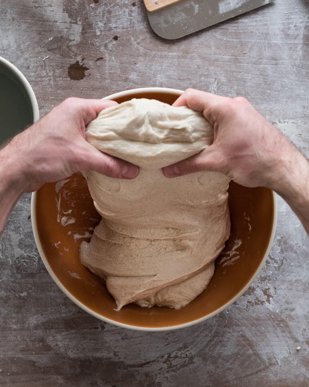 Each set of stretches and folds consists of 4 folds: one each at the North, South, East, and West sides. Wet your hands with a little water to prevent sticking, and then lift one side (North) of the dough with two hands. Stretch the dough up high enough just so that you can fold it completely over to the other side of the dough. Rotate the bowl 180° and do the other side (South). Finish the other two sides (East and West) to complete the set. Let the dough rest for 30 minutes, covered, between sets.