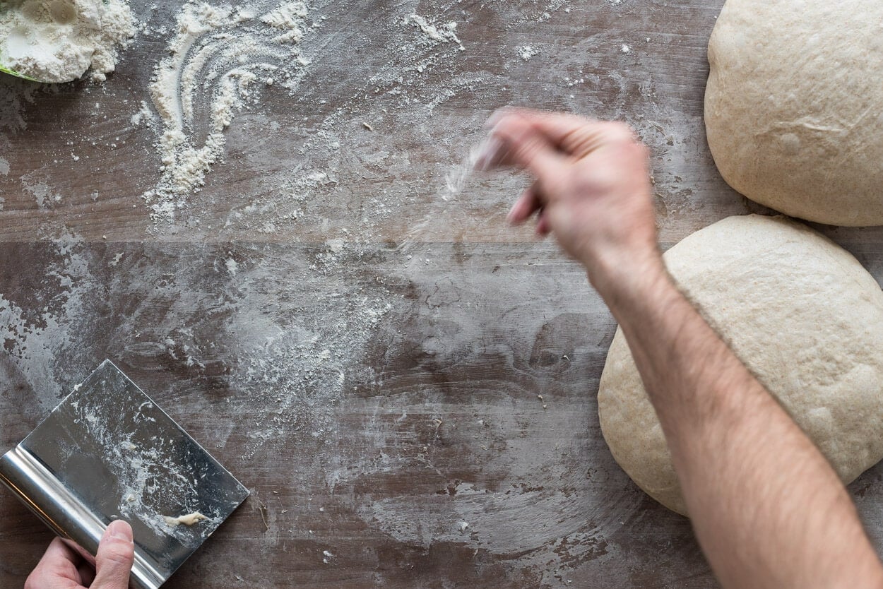 Lightly flour the top of your dough rounds and the work surface. Working with one round at a time, flip the round so the floured top is now down on the floured work surface.