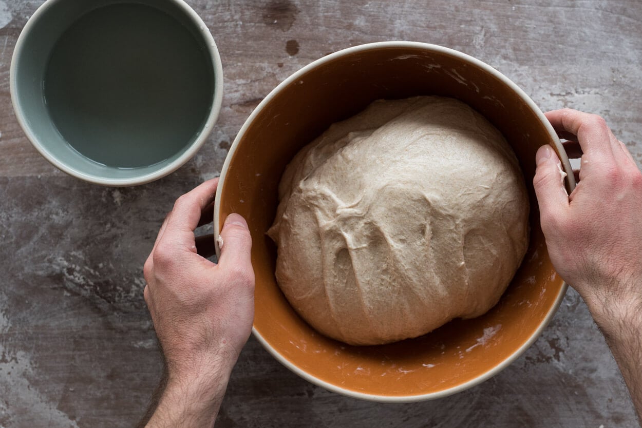 At the end of bulk fermentation, your dough should have risen anywhere between 20% and 50%. It should show some bubbles on the top and sides, and the edge of the dough where it meets the bowl should be slightly domed, which indicates strength. In the photo above, you can see all these signs. If you don’t see these signs, leave it for another 15 minutes in bulk fermentation and check again.