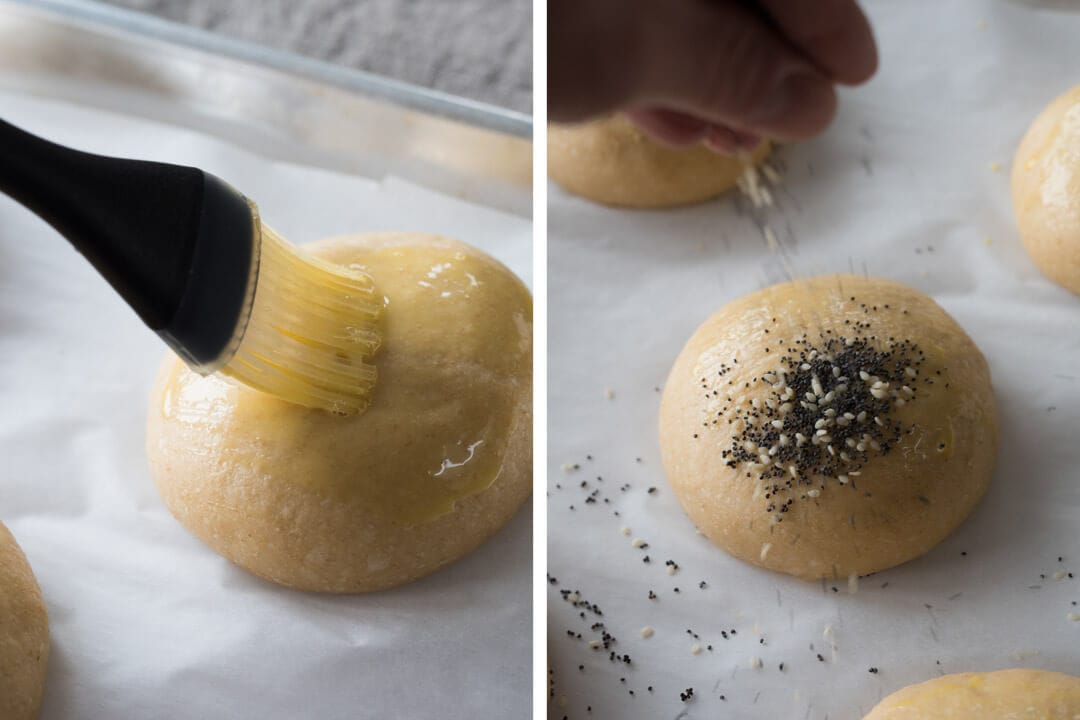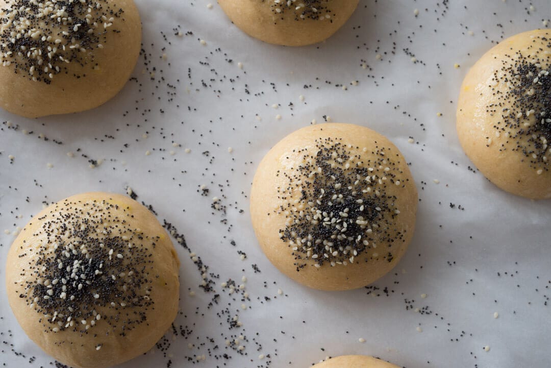 I mixed together 50% white sesame seeds and 50% poppy seeds for the topping of each bun. After the egg wash is applied spread some seeds on top as desired.