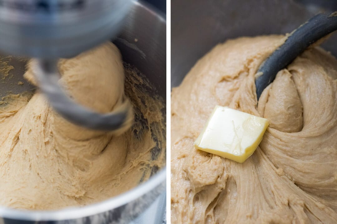 Turn the mixer down to speed 3 and start adding the butter one pat at a time right where the dough hook meets the dough mass. Wait to add the next pat until the previous one is fully incorporated and continue until all the butter is worked into the dough.