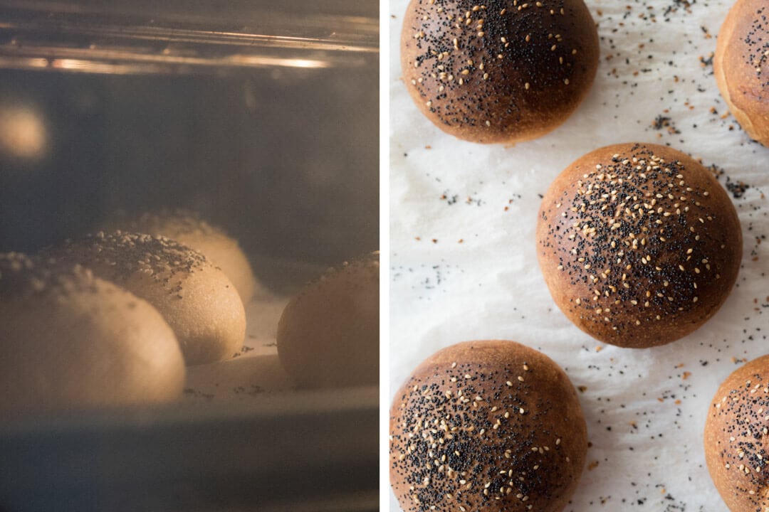 You don’t need to bake these on a pizza stone or Baking Steel, they’ll bake right on their own baking sheet. Because these brioche hamburger buns are topped with an egg wash, there is no need to steam the oven.