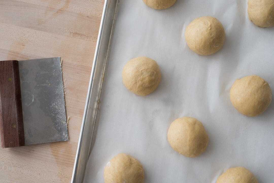 There’s no need to preshape this dough because we’re shaping it directly into small balls for final proofing. Prepare a full-sized baking sheet and another half sheet by lining them with parchment paper.