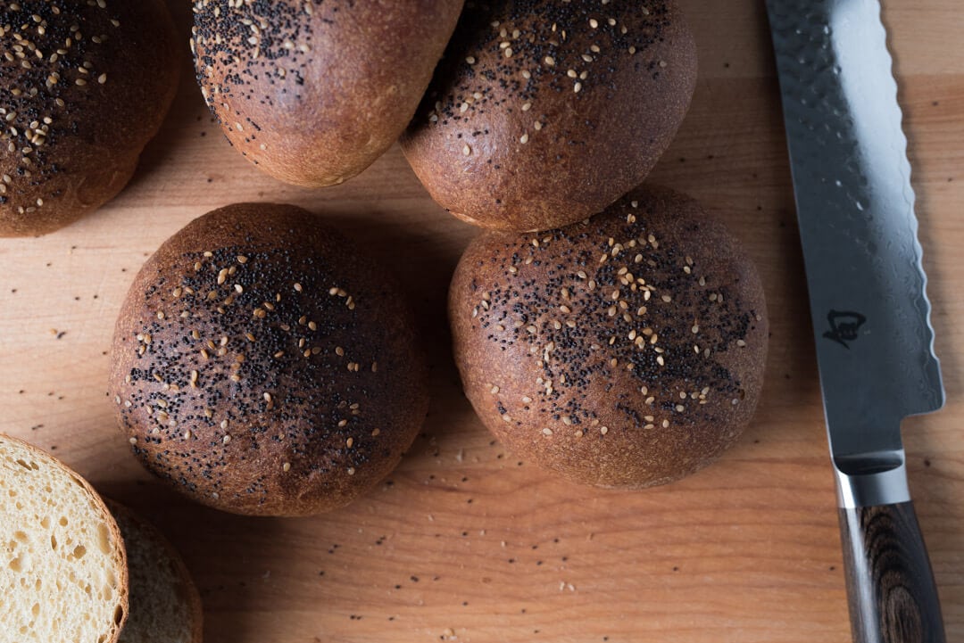 However, this brioche hamburger bun recipe would work very well with 100% white flour or a different type of whole grain for the white wheat component—be sure to adjust the milk percentage up or down to suit.