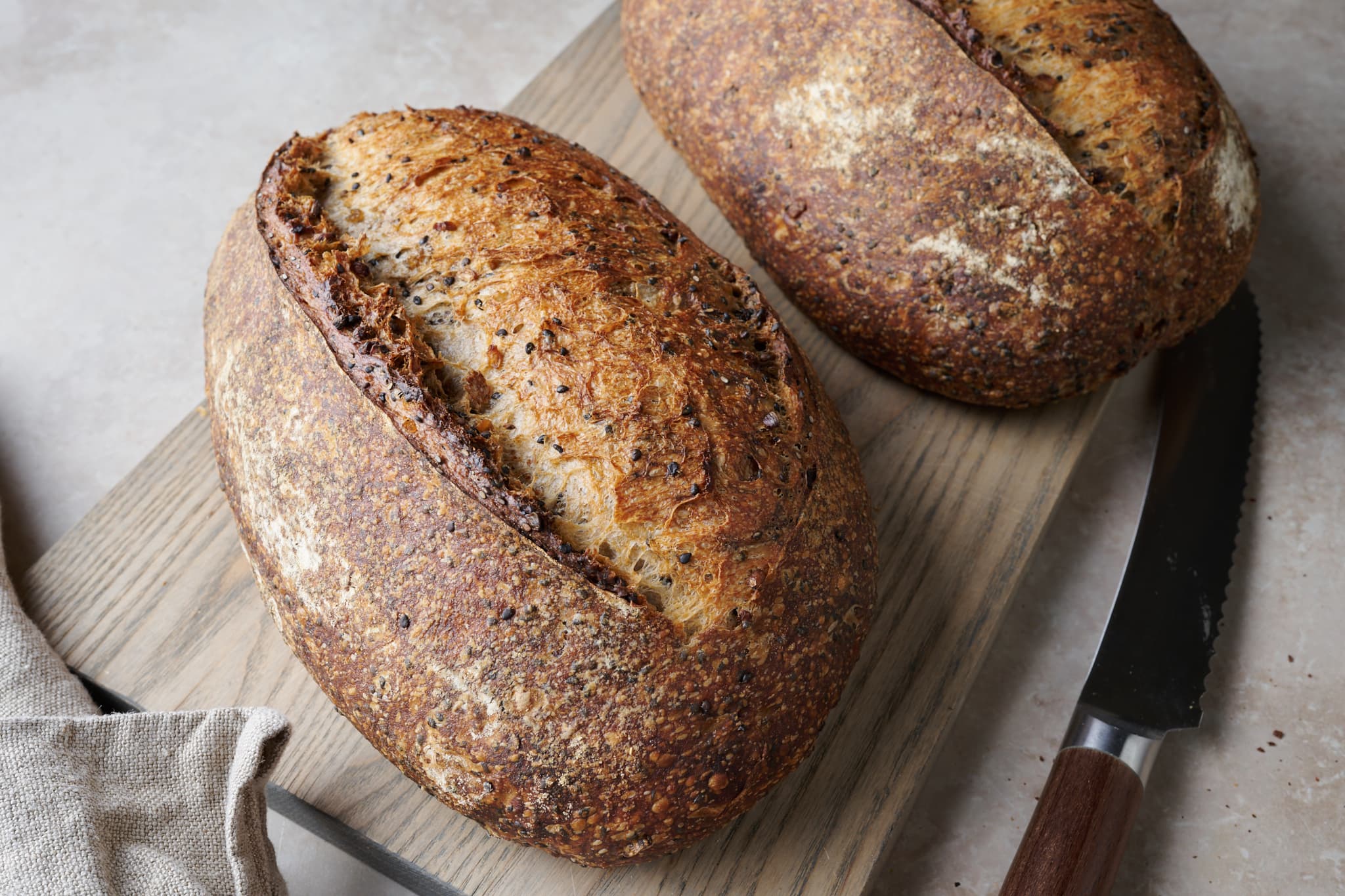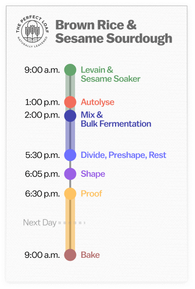 This brown rice sourdough is made over two days. On day one, mix the levain, prepare the rice and seed soaker early in the morning, mix in the afternoon, and finally retard (cold-proof) the dough overnight in the refrigerator. Then, bake the loaves first thing the next morning.