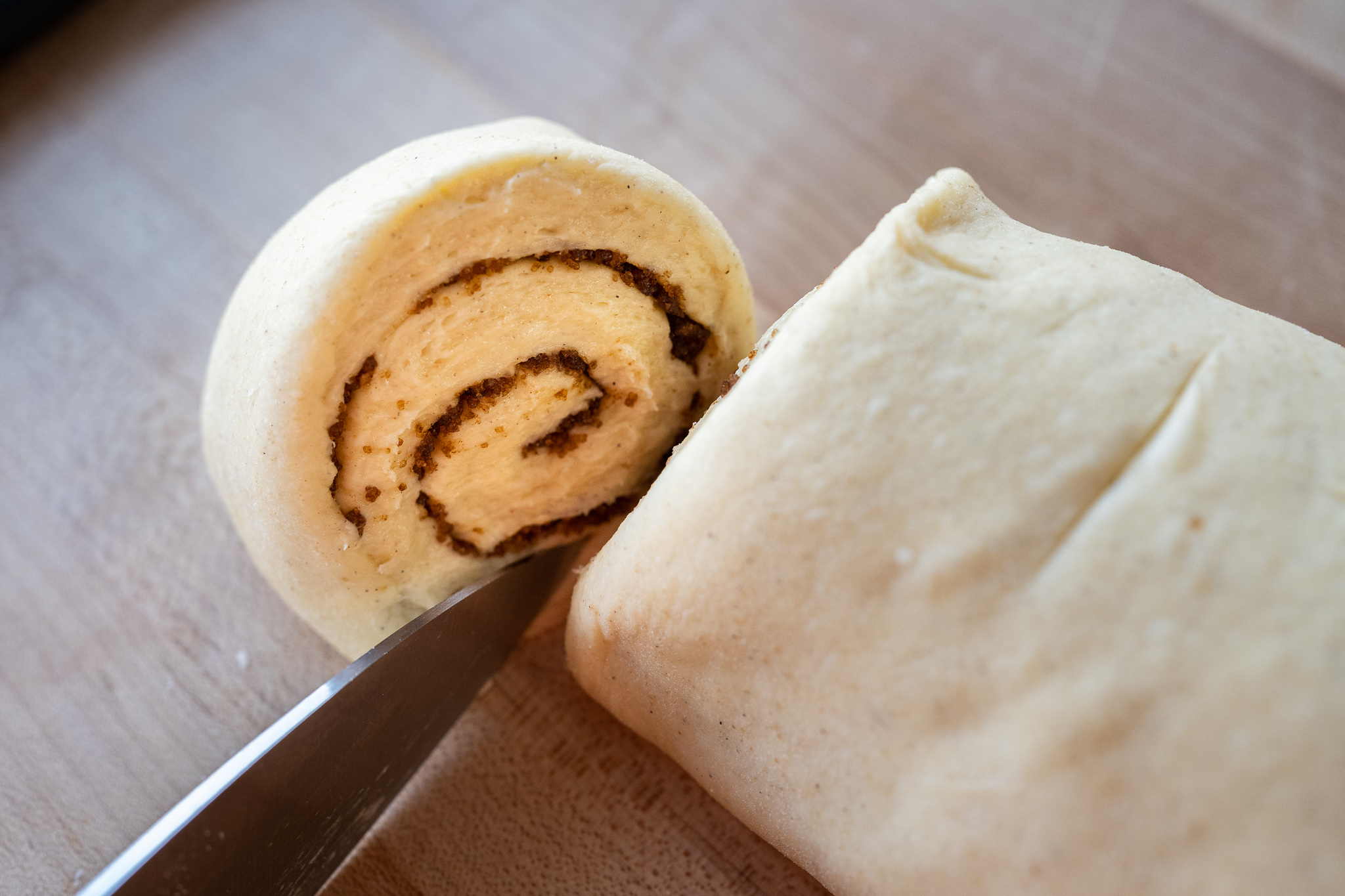 Once finished rolling up the dough, divide it into nine 1 1/2″ pieces using a sharp knife. Transfer the pieces to the prepared baking pan and cover with a large, reusable bag.