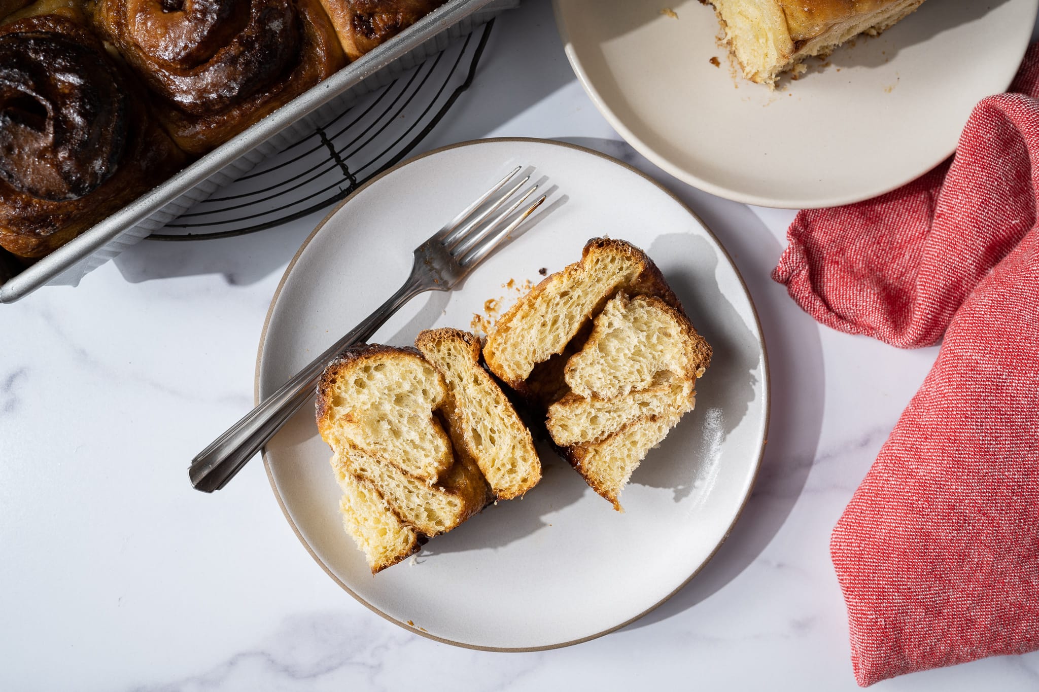 This recipe will work well with any all-purpose flour or medium-protein bread flour (11-12% protein). The dough is on the stiffer side before the butter is added, so if you’re using a higher protein white flour or one that’s especially absorbent, you might need to adjust with an added dash of milk.