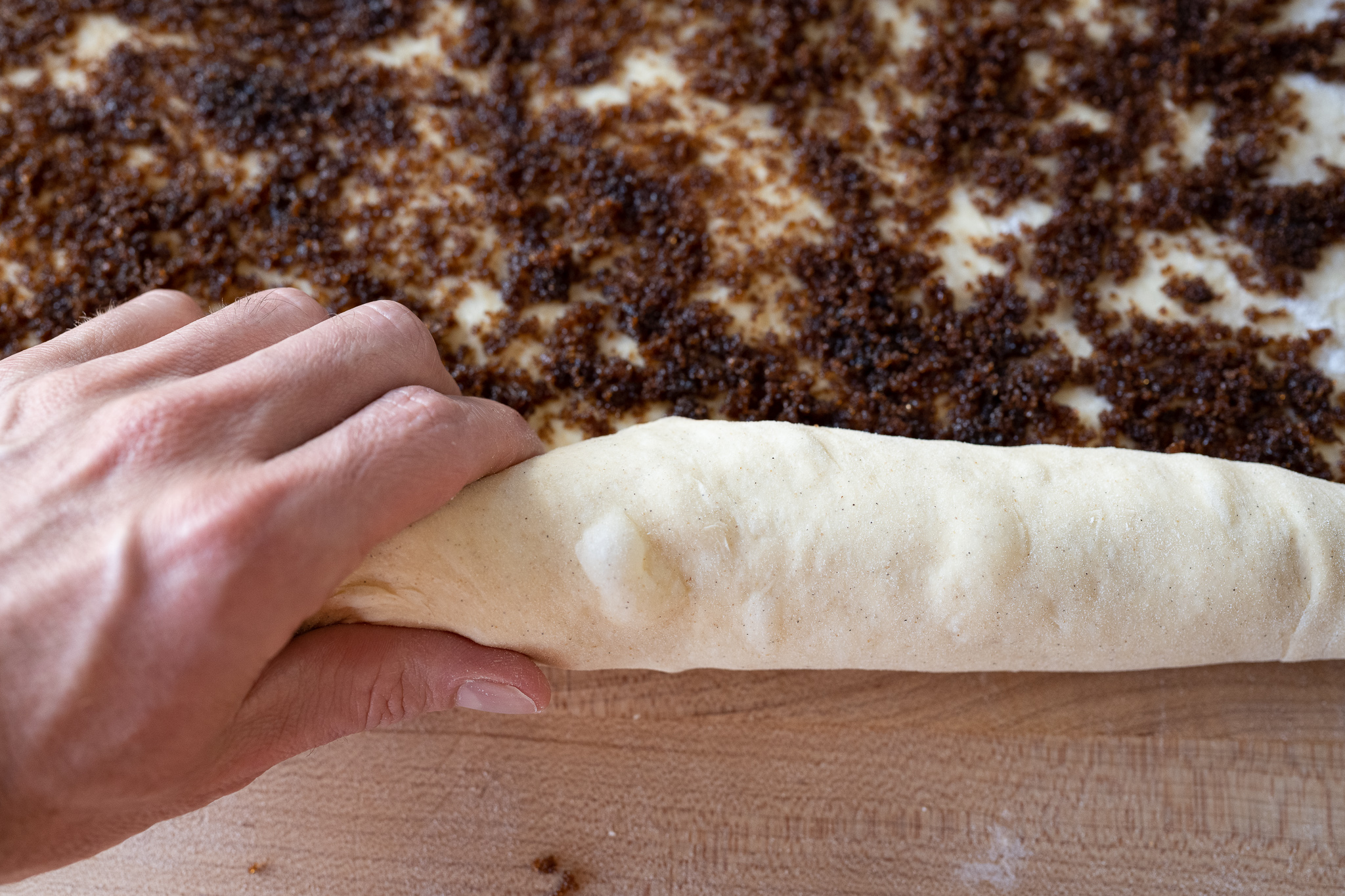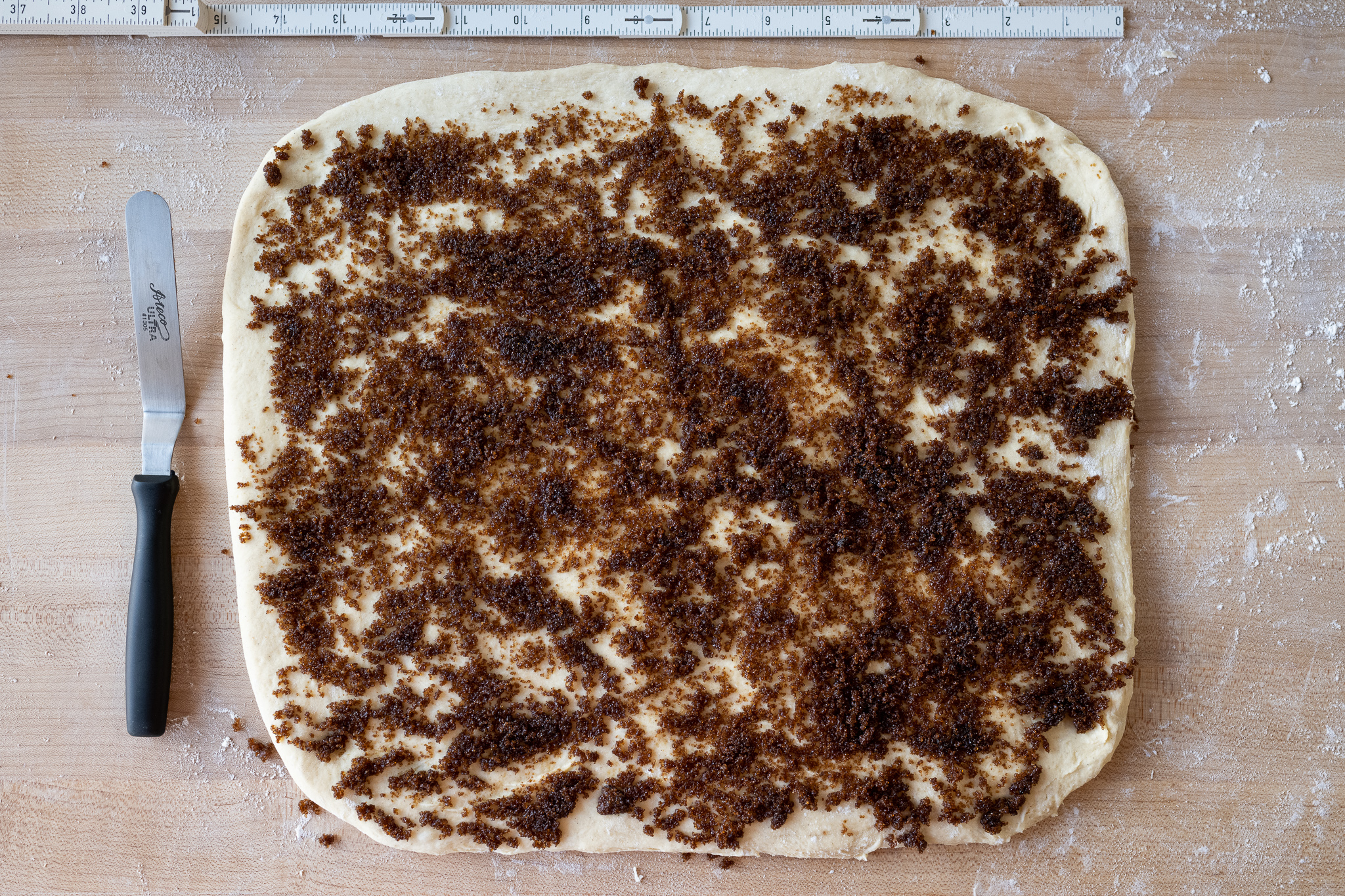 As shown above, use a small offset spatula or your hands to spread on the cardamom and cinnamon filling evenly. It may look and feel like not enough filling, but there’s plenty when the dough is rolled up.
