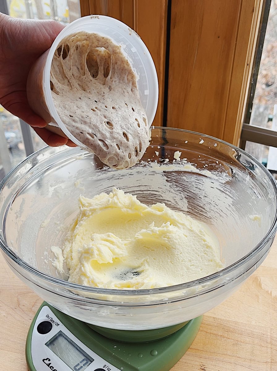- Add the butter and sugar to a large bowl or the bowl of a stand mixer, and use an electric mixer on medium speed or the stand mixer fitted with the paddle attachment to cream the mixture until light and fluffy, about 3 minutes, scraping down the bowl halfway. Scrape down the bowl, then beat in sourdough discard and vanilla extract on medium low speed until combined. Scrape down the bowl again, then on low speed beat in the flour and salt until combined.