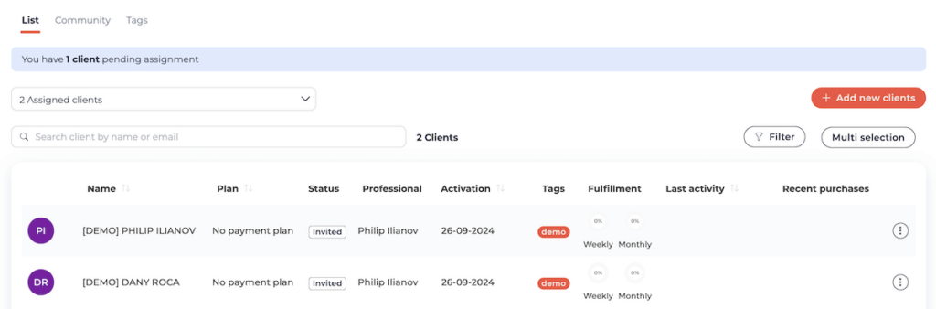 Your client list shows the most relevant information: the client’s name, training plan, progress on the plan, activity in the last seven days, and assigned coach (in case it’s someone from your team).