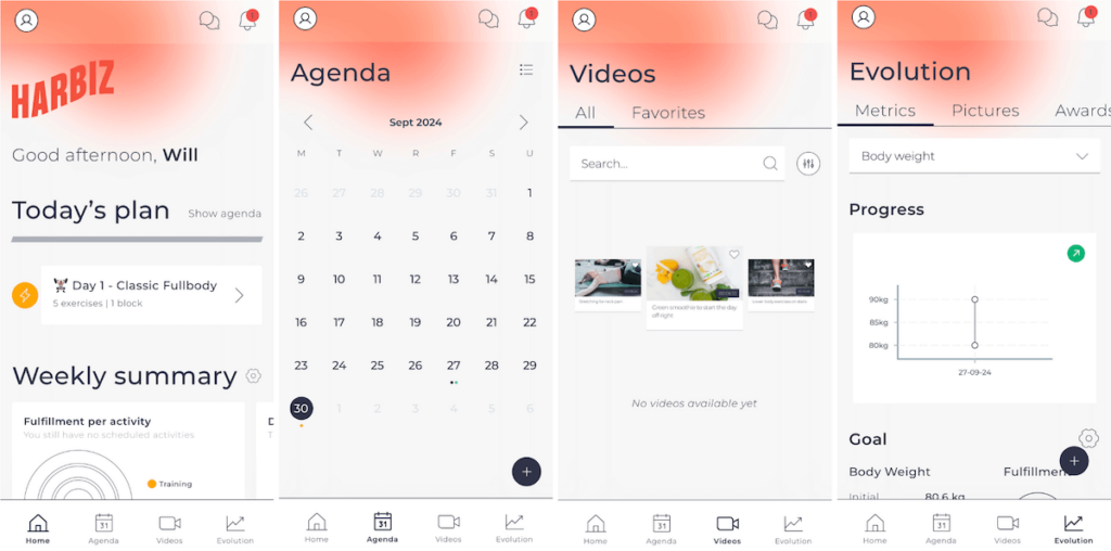 The Harbiz app allows clients to see their assigned workouts and other activities, access their calendars to log previously completed tasks, watch prescribed educational videos, log their progress, and chat with their coach.