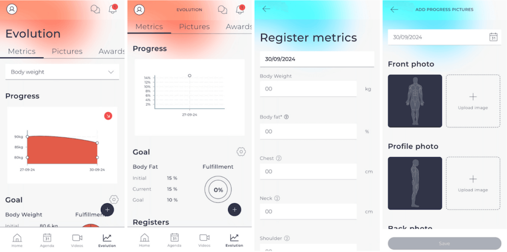The progress tracking section is quite thorough. Your clients can upload body weight, body fat, and circumference measurements and set goals for each metric. They can also upload progress photos and review them anytime.