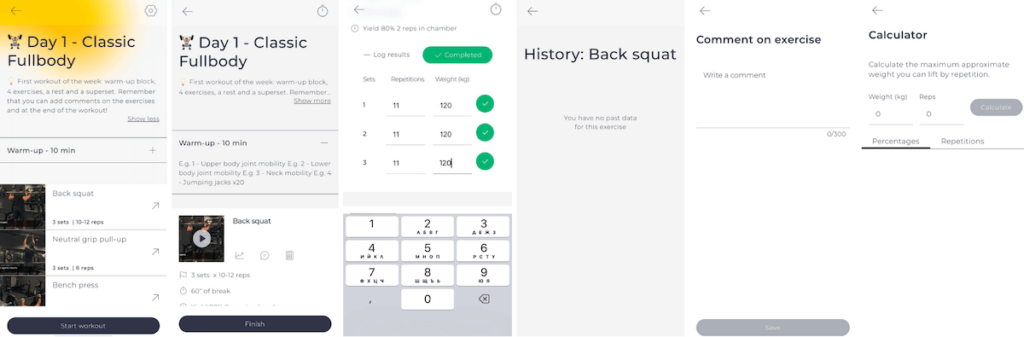 Clients can log each exercise and input the weight and reps or duration set by set, review performance history, write a comment for any movements, and use the built-in calculator.