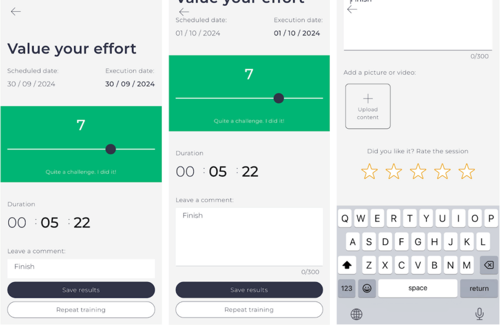 Before marking the workout as complete, clients can use a slider to select a difficulty from 1 to 10, set a duration, leave a comment for the coach, upload an image or video, and rate the workout.