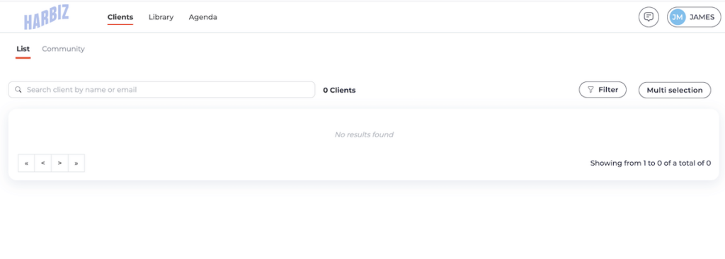 That said, coaches you invite to your team can access a limited version of Harbiz with only three menu options: Clients, Library, and Agenda.