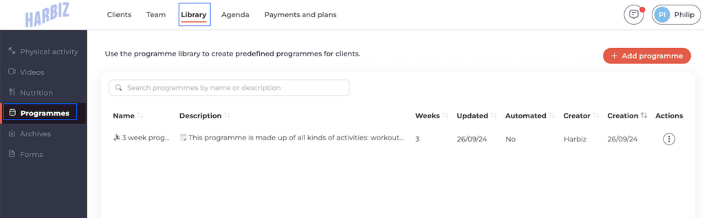 You can access Harbiz’s program library by clicking Library and selecting Programmes. The library lists individual programs with basic information: name, description, duration, the creator’s name, and the creation date.