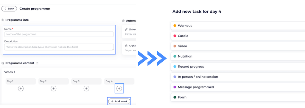 You can edit existing programs and create new ones from scratch. To build a new program, write a name and a brief description, and add as many weeks as you want. You can then assign a workout, cardio session, nutritional targets, a reminder to record progress, a form, or a message to any day.