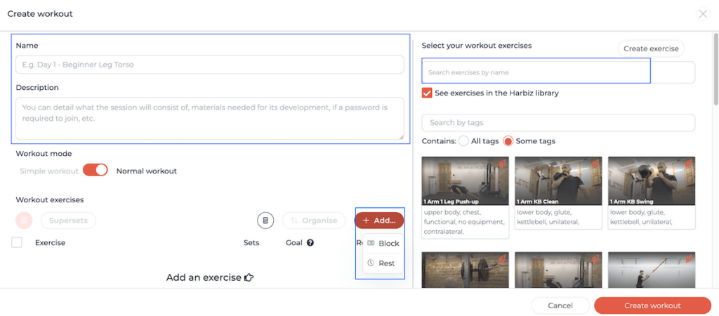 Harbiz’s workout builder has several functions worth discussing. To start, name the workout you’re creating and write a brief description. Below that, you can add: