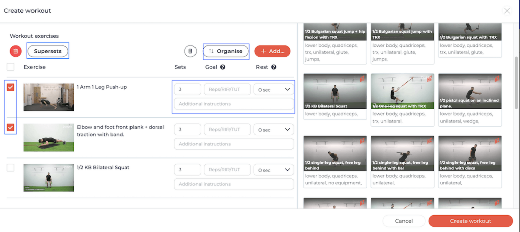 Once you add a movement to the workout, you can write the number of sets, the goal (such as rep target, RIR, or TUT), the recovery time, and a custom note with a tip or additional information. You can pair two or more exercises into a superset and click Organise to enable the drag-and-drop functions and rearrange the movements.