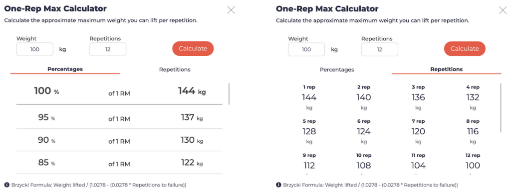 There’s also a built-in 1RM calculator based on the Brzycki formula. It shows percentages and a rough guideline of how many reps the client should be able to do with different weights.