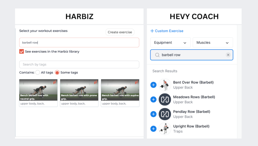 First, finding the right exercises is far easier on Hevy Coach than on Harbiz. You use basic search terms like bench press or barbell row to find the right movements, whereas the Harbiz library often brings up irrelevant search results.