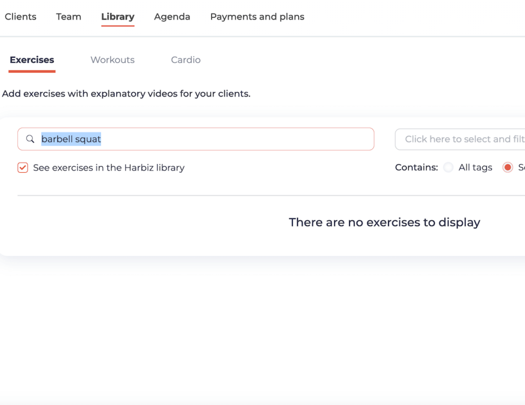 The search bar is also not the most sophisticated one and often brings up irrelevant results or no results at all. For example, searching for barbell squats doesn’t bring up anything: