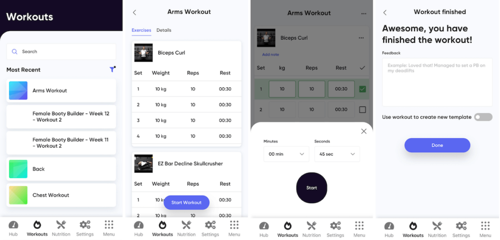 Clients can add, swap, or remove exercises and track their rest periods using a built-in stopwatch. The rest timer doesn’t start automatically like in the Hevy client app.