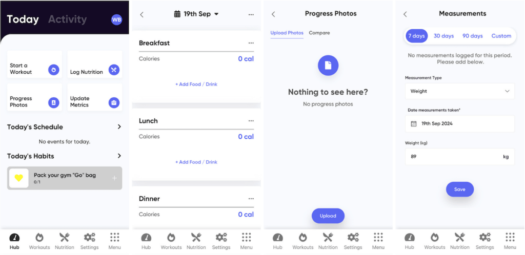 MyPTHub’s client app is quite detailed and has many options. Clients can start and log workouts, log their nutrition, upload progress photos, and add body metrics, among other things.