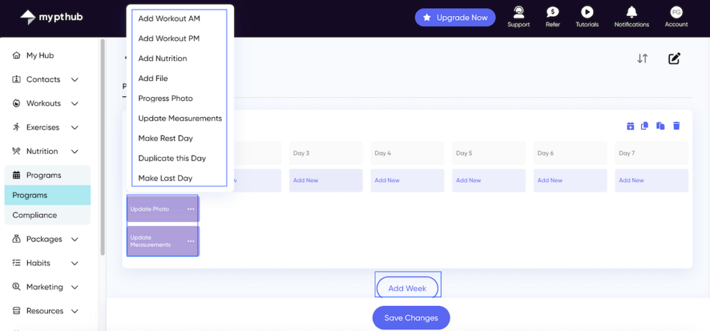 You can also create programs from scratch. Start with a name, write a brief description, and add as many weeks as you want. Click on any day of the week to add a workout, a file, or nutritional guidance. You can also assign reminders for the client to update body measurements and upload progress photos.