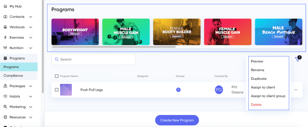 Once saved in your library, you can duplicate, assign, or delete the program. However, there aren’t any options to organize your existing programs in folders or with tags. This can be problematic if you work with more clients and have dozens of programs in your library.