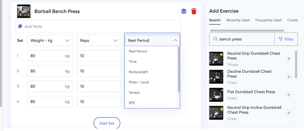 The three default variables differ based on movement––for example, you get weight, reps, and rest period for the barbell bench press. However, you can select different variables in each column from a pop-up menu. This allows for good customizability when creating workouts for various clients.