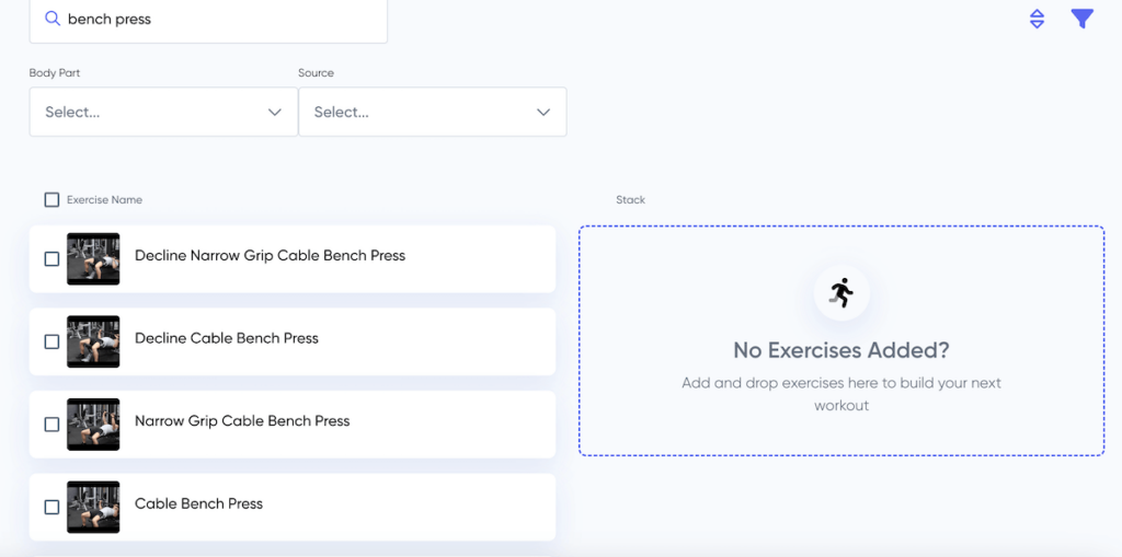 Third, the Hevy Coach builder is more flexible because you can use the drag-and-drop function to move exercises around anytime. You can also click the three dots icon on each movement to swap it for another.