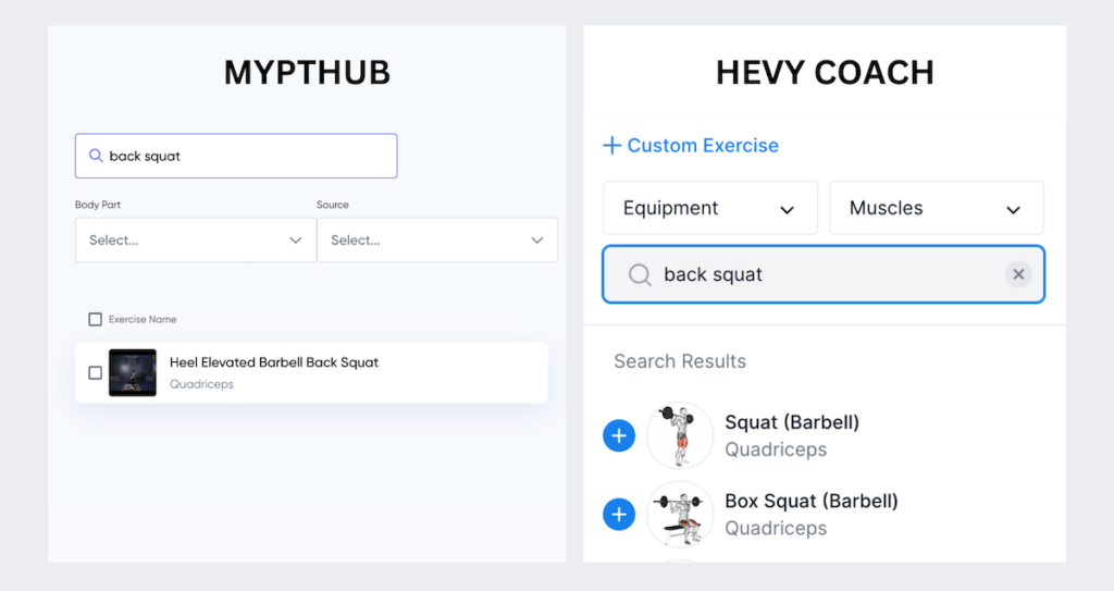 In contrast, the Hevy Coach library is smaller but more curated. Еach entry is of higher quality and is more relevant for personal trainers and strength coaches.